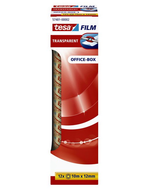 * Tesafilm Transparant. * Dit transparante plakband is zeer geschikt voor vele uiteenlopende gebruiksdoeleinden op kantoor en thuis door haar betrouwbare en sterke kleefkracht. * Bevat uitstekende kleefeigenschappen. * Gemakkelijk afrolbaar en verouderingsbestendig. * PP folie en oplosmiddelvrij. * Verpakkingseenheid doos à 12 rol. 1 doos x 12 stuk