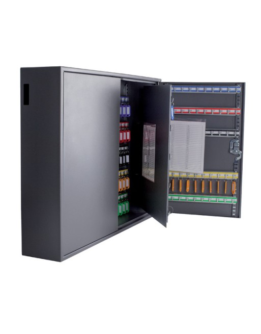 * Bewaar uw sleutels veilig in een sleutelkast. * XL-uitvoering geschikt voor 300 sleutels. * Key Return opening, waardoor men zijn/haar sleutel weer eenvoudig kan retourneren ook als de sleutelkast gesloten is. * Metalen sleutelhaken (niet verstelbaar). * Compleet met 300 sleutelhangers, genummerde haken, bevestigingsmateriaal en 2 sleutels om de sleutelkast te sluiten/openen. * Kleur: donkergrijs mat finish.