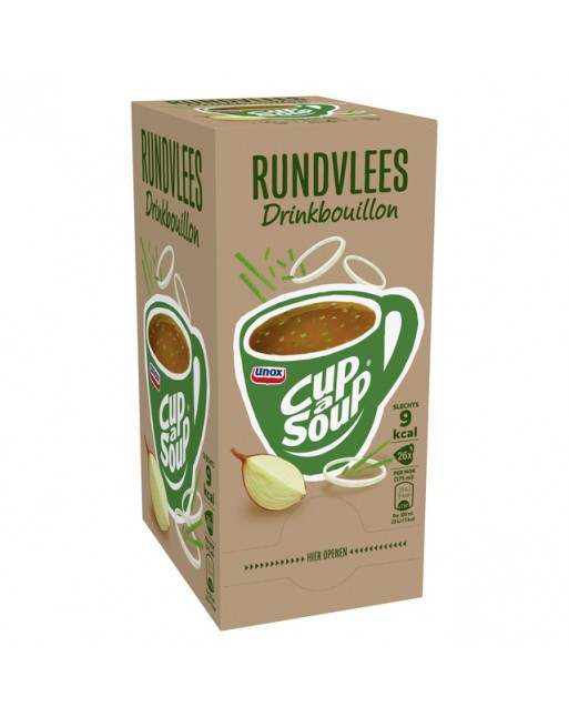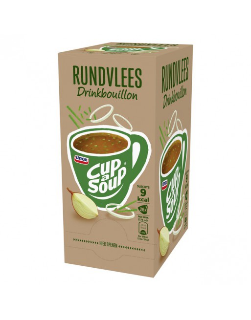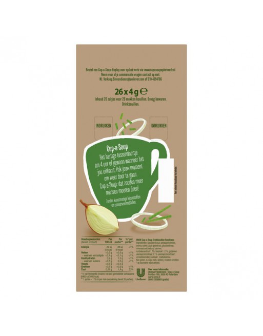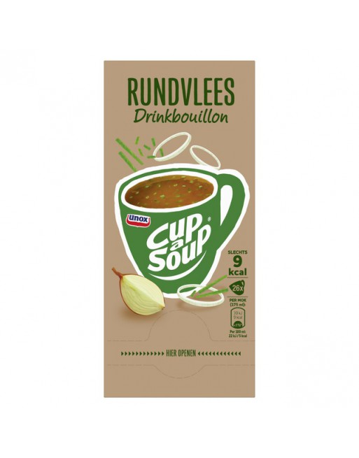 * Met Cup-a-Soup blijft iedereen scherp en alert. * Op het werk, op school, of bijvoorbeeld op de sportclub. * Cup-a-Soup heeft verrassend lekker nieuws, we zijn vernieuwd! * Goede smaak kan alleen slagen met de beste ingrediënten. * Daarom is Cup-a-Soup nu zonder toegevoegde smaakversterkers, kunstmatige kleurstoffen en conserveermiddelen. * Dozen met losse zakjes soep. * Navullingen voor de carrousel. * 10 punten voor de smaak en 7 voor de calorieën. * Was alles maar zo lekker als deze pittige bouillon. * Maar helaas, onze koks maken alleen soep. * En dat doen ze goed. 1 doos x 26 zak
