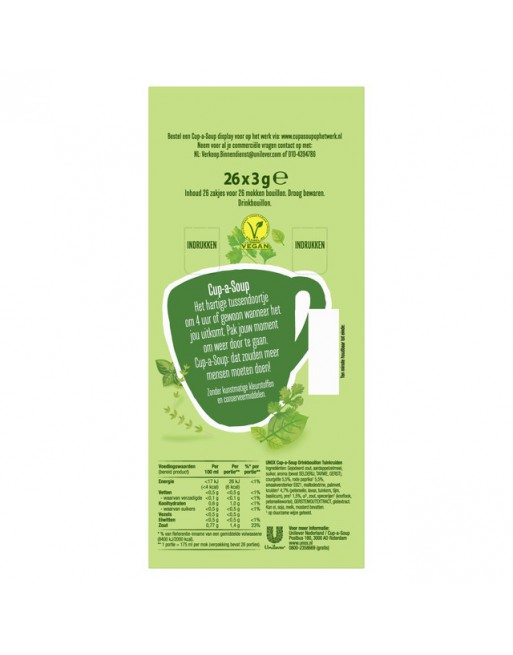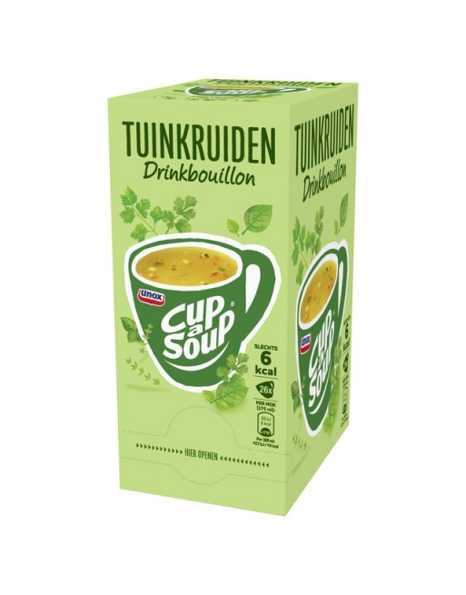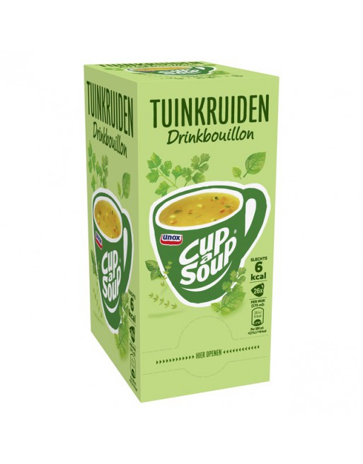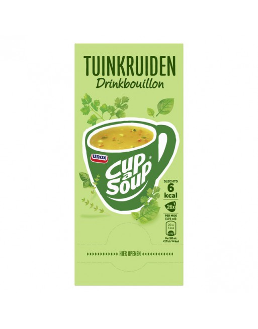 * Met Cup-a-Soup blijft iedereen scherp en alert. * Op het werk, op school, of bijvoorbeeld op de sportclub. * Cup-a-Soup heeft verrassend lekker nieuws, we zijn vernieuwd! * Goede smaak kan alleen slagen met de beste ingrediënten. * Daarom is Cup-a-Soup nu zonder toegevoegde smaakversterkers, kunstmatige kleurstoffen en conserveermiddelen. * Dozen met losse zakjes soep. * Navullingen voor de carrousel. * Een volstrekt vegetarisch verantwoorde oppepper. * De pittige smaak van tuinkruiden geeft je weer energie. 1 doos x 26 zak