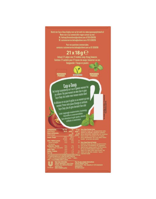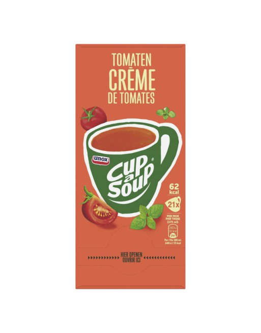 * Met Cup-a-Soup blijft iedereen scherp en alert. * Op het werk, op school, of bijvoorbeeld op de sportclub. * Cup-a-Soup heeft verrassend lekker nieuws, we zijn vernieuwd! * Goede smaak kan alleen slagen met de beste ingrediënten. * Daarom is Cup-a-Soup nu zonder toegevoegde smaakversterkers, kunstmatige kleurstoffen en conserveermiddelen. * Dozen met losse zakjes soep. * Navullingen voor de carrousel. * Nou zijn tomaten van zichzelf al niet echt scherp, maar we wilden toch proberen of we ze nog zachter konden krijgen. * En dat is gelukt! * Om niet meteen helemaal door te schieten, hebben we er nog wat fijne kruiden bijgedaan. 1 doos x 21 zak