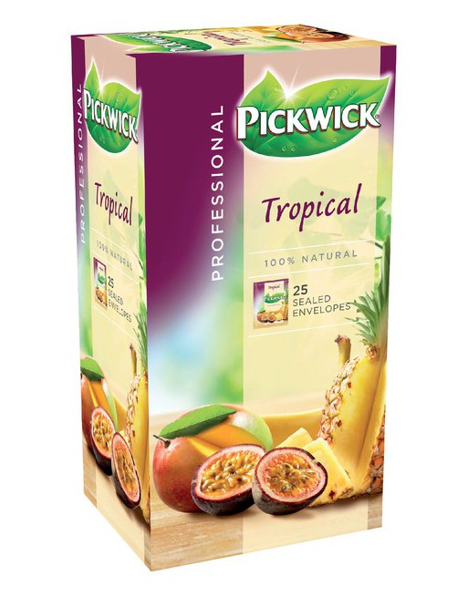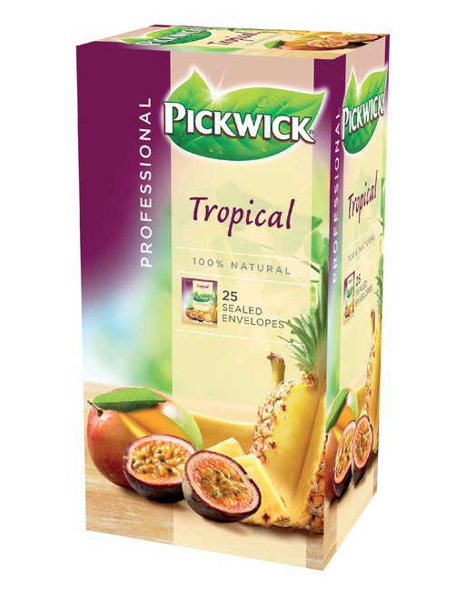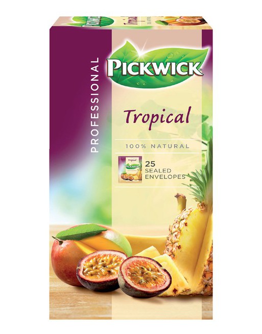 * Een lekkere kop Pickwick thee voor uw werknemers of gasten? * Als zakelijke klant kunt u bij ons gemakkelijk online thee bestellen. * Daarnaast bieden we ook zes Fairtrade thee varianten. * Thee in diverse smaken. * De zakjes zijn individueel verpakt. * Deze smaken thee wordt geleverd per 3 dozen à 25 zakjes. * Utz gecertificeerd. * Als Basis voor deze melange kozen we theesoorten uit o.a. Indonesië en Afrika met een lichte smaak. * Zo komen de stukjes tropische vruchten en het aroma die we aan deze melange toevoegen goed tot hun recht. * Er ontstaat een fruitige thee met een heerlijke tropische vruchten smaak, om elk moment van de dag lekker van te genieten. 3 pak x 25 stuk