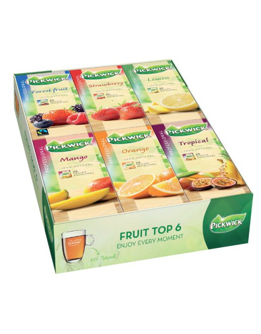 * Thee in diverse smaken. * De Pickwick Thee top 10 biedt u een gevarieerd aanbod theemelanges. * De zakjes zijn individueel verpakt. * Deze thee wordt geleverd per 6 of 10 dozen à 25 zakjes. Deze set bevat de volgende smaken: Bosvruchten, Aardbeien, Citroen, Mango, Sinaasappel en Tropische vruchten. 1 pak x 6x25 stuk