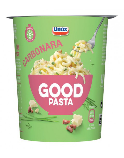 * Heb je trek na het sporten of ben je toe aan een opkikker aan het eind van de middag? * Het bereiden van Unox Good Pasta is zo gepiept. * Giet kokend water op de Good Pasta tot aan de lijn in de cup en binnen 5 minuten kun je genieten van een portie overheerlijke pasta. * Deegwaar in sauspoeder.