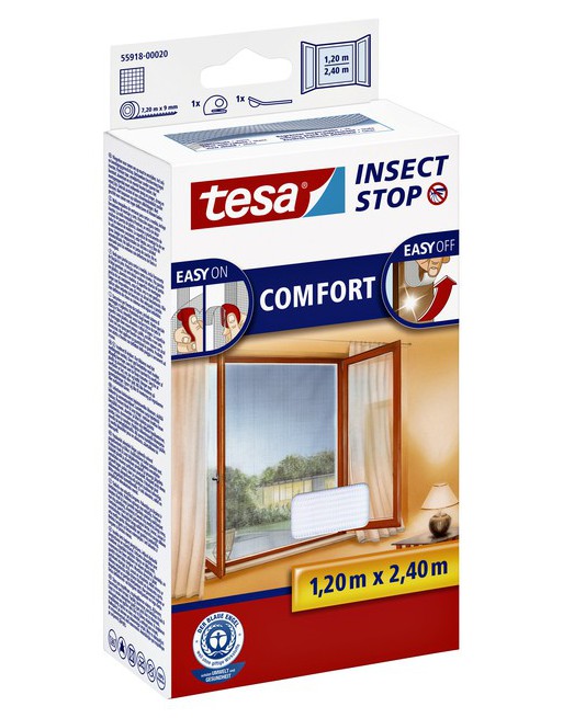 * Tesa Insect Stop Comfort voor ramen is een unieke bescherming tegen insecten met klittenband. * Het bevat een easy-on- en easy-off-oplossing waarmee je het raam open kunt laten staan en de muggen en andere insecten buiten kunt houden. * Deze zeer effectieve hor is verkrijgbaar in twee kleuren en verschillende maten, geschikt voor de meeste kozijnen. * Deze Insect Stop is snel en eenvoudig te plaatsen: plak de meegeleverde klittenbandtape gewoon op het raamkozijn, druk het gaas ertegen en je bent klaar. * Verwijderen van het gaas is al net zo eenvoudig en laat geen zichtbare sporen achter. * UV-bestendig. * Wasbaar op max 30°C. * Herbruikbare hor. * Verkrijgbaar in wit en antraciet. * Kleur wit. * Afmeting 120x240cm: is de maximale afmeting en kan eventueel op maat geknipt worden.