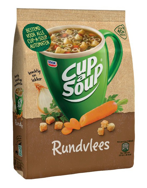 * Met Cup-a-Soup blijft iedereen scherp en alert. * Op het werk, op school, of bijvoorbeeld op de sportclub. * Cup-a-Soup heeft verrassend lekker nieuws, we zijn vernieuwd! * Goede smaak kan alleen slagen met de beste ingrediënten. * Daarom is Cup-a-Soup nu zonder toegevoegde smaakversterkers, kunstmatige kleurstoffen en conserveermiddelen. * Navulzakken voor de Mini automaat. *Cup-a-Soup rundvlees, met de door onze boeren verbouwde beste ingrediënten van het land! * We drogen deze ingrediënten zorgvuldig en voegen de juiste hoeveelheid kruiden toe voor de lekkerste smaak! * In deze Cup-a-Soup variant zitten geen smaakversterkers, kunstmatige kleurstoffen en conserveermiddelen. * Het is daarnaast voorzien van het ‘Ik-kies-bewust-logo’. 1 zak x 40 portie