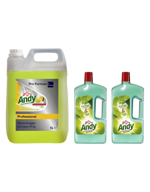 * Speciale professionele, geconcentreerde dagelijkse allesreiniger met een heerlijk parfum. * De vertrouwde, krachtige Andy formule neemt vuil en vet snel op en laat geen strepen achter.* Veiligheidsinformatie. * Veroorzaakt ernstige oogirritatie. * Bij contact met de ogen dienen ogen voorzichtig afgespoeld te worden met water gedurende een aantal minuten en contactlenzen, indien mogelijk, verwijderen. * Raadpleeg een arts bij aanhoudende oogirritatie. * Handen grondig wassen na het werken met dit product. * Houdt bij het inwinnen van medisch advies de verpakking of het etiket te beschikking. 1 fles x 5 liter