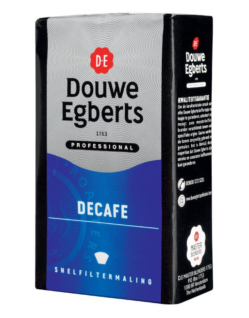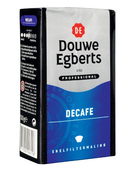 * Douwe Egberts kwaliteitskoffie in snelfiltermaling. * Douwe Egberts aroma rood is de geurige, pittige koffie die in Nederland het meest gedronken wordt. * Dat komt onder andere door de evenwichtige melange van krachtige Robustabonen en aromatische Arabicabonen die kort en vol worden gebrand. * Douwe Egberts Décafé is een geurige, pittige koffie voor die momenten waarop je de cafeïne in koffie niet nodig hebt. 1 pak x 250 gram