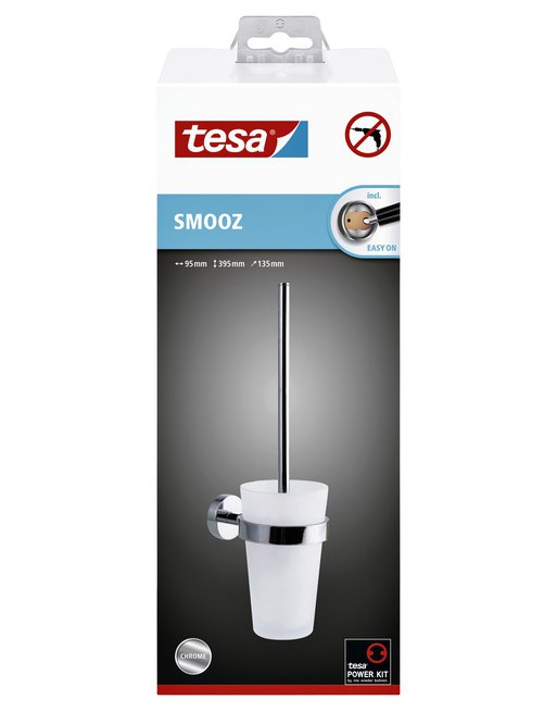 * TesaSmooz is een hoogwaardige toiletborstelset die aan de muur kan worden gemonteerd zonder te boren. * Met de innovatieve tesaPower.Kit zelfklevende technologie kan de aantrekkelijke toiletborstelset eenvoudig aan de muur worden bevestigd, zonder extra gereedschap. * De lijm heeft 12 uur nodig om volledig uit te harden en zal vervolgens de toiletborstelhouder betrouwbaar bevestigen. * Toch kan de toiletborstelset eenvoudig worden verwijderd zonder lijmresten achter te laten of de tegels te beschadigen. * Eenvoudig en elegant, hoogglans verchroomd metaal, afgerond ontwerp, gesatineerd glas. * Stevige hechting, waterproof, gegarandeerd roestvrij. * Niet geschikt voor behang en stucwerk. * Afmetingen product 395x95x135mm.