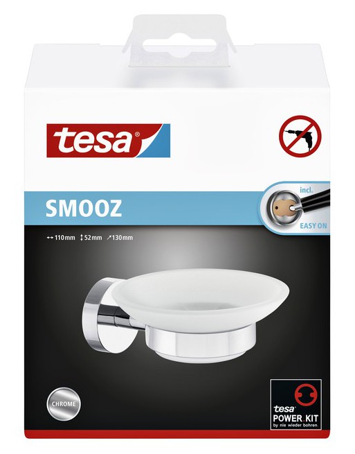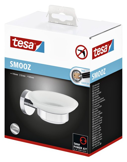 * De TesaSmooz zeephouder is een handige en aantrekkelijk badkameraccessoire die overal kan worden gemonteerd waar hij het meest nodig is. * Met een zelfklevende montage-oplossing kun je zelf kiezen waar je hem wilt ophangen. * Boren is niet nodig, wat ook betekent dat je tegels of muren onbeschadigd blijven. * In plaats daarvan biedt de lijm, na 12 uur drogen, een net zo betrouwbare hechting als conventionele methoden. * Hoogglans verchroomd metaal, afgerond ontwerp, ronde muurplaat, gesatineerd glas. * Betrouwbare en eenvoudige bevestiging, waterproof, gegarandeerd roestvrij. * Niet geschikt voor behang en stucwerk. * Afmetingen product 52x110x130mm.