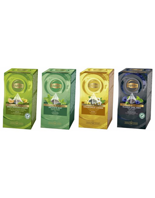 * Lipton Exclusive Selection is hét concept bij uitstek voor bedrijven en restaurants. * Het Lipton Exclusive Selection is een zorgvuldig uitgekozen range van 12 verschillende varianten om aan de verschillende voorkeuren van uw gasten te voldoen. * Het assortiment bevat lange theeblaadjes en kruiden, gecombineerd met zichtbare stukjes fruit en bloemen. * De thee zit verpakt in een semi-transparant, piramidevormig theebuiltje. * De piramidevorm verzekert meer plaats voor de ingrediënten om te bewegen tijdens de infusie met een uitstekend aroma, smaak en kleur als gevolg. * 25 piramidezakjes van 2gram.