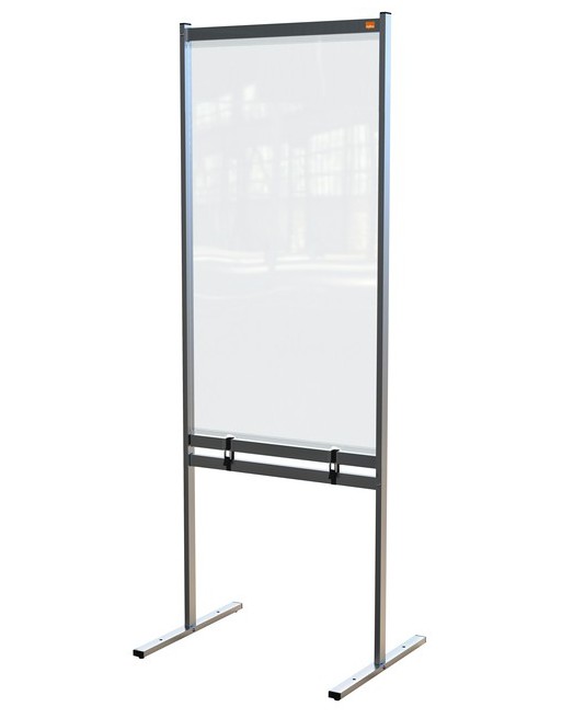 * De Nobo doorzichtige PVC scheidingswand voor op de vloer biedt een eenvoudige maar effectieve oplossing voor de sociale afstand die we moeten aanhouden, terwijl het ook duidelijke en veilige communicatie mogelijk maakt. * De scheidingswand voor op de vloer kan zowel binnen als buiten worden gebruikt met de optie om het PVC scherm op te rollen voor eenvoudige opslag. * Gebruik indien nodig extra gewichten voor meer stabiliteit (product 1386183). * Hoogte is 2meter vanaf de vloer; biedt een hoge mate van sociale afstandsbescherming voor zowel zittende als staande personen. * Het PVC-oppervlak van 500 micron kan gemakkelijk worden schoongeveegd en het transparante ontwerp zorgt ervoor dat natuurlijk licht niet wordt beperkt of verminderd. * Beschikt over een weerbestendige, gepoedercoate laag die geschikt is voor zowel binnen als buiten. * Formaat: 780x2060mm - schermhoogte is 2000mm; biedt een hoog beschermingsniveau in elke omgeving. * Afmetingen (mm): B780xH2060xD610 - gewicht: 6,3kg. * Stabiel en toch draagbaar. * Geschikt voor veelzijdig gebruik, voor zowel binnen als buiten. * Robuust PVC-scherm van 500 micron met een weerbestendige, gepoedercoate frame. * Het transparante ontwerp zorgt voor duidelijke communicatie terwijl je beschermd blijft. * Snel en eenvoudig te monteren door één persoon. * Reinig met een schone, zachte microvezeldoek met water en zeep.