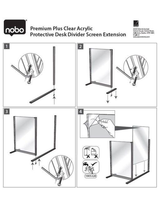 * Het Nobo bureau uitbreidingspaneel van transparant acryl helpt om de sociale afstandsmaatregelen te optimaliseren. * Verbind eenvoudig het paneel met een bureauscherm; biedt een flexibele, modulaire configuratie die past bij elke omgeving. * Het uitbreidingspaneel heeft een totale hoogte van 1.80m bij plaatsing op een standaard bureau en biedt een hoge mate van bescherming voor zowel zittende als staande personen. * Het robuuste plexiglas oppervlak kan eenvoudig worden schoongeveegd en het transparante design zorgt ervoor dat natuurlijk licht niet wordt beperkt of verminderd en maakt duidelijke en veilige communicatie mogelijk. * Voorzien van een handig geanodiseerd frame met een kleine 20mm opening aan de onderzijde voor het eenvoudig doorvoeren van kabels. * Formaat: 1200x1000mm - totale hoogte is 1.80m bij plaatsing op een standaard bureau; biedt een hoge mate van sociale afstandsbescherming. * Afmetingen (mm): B1200xH1000xD400 - gewicht: 5,8kg. * Stevig aluminium frame. * Creër een veelzijdige en aanpasbare configuratie die past bij jouw ruimte. * Het transparante design zorgt voor duidelijke en gezamenlijke communicatie terwijl je beschermd blijft. Natuurlijk licht wordt niet beperkt of verminderd. * Snel en eenvoudig te monteren door één persoon. * Maak schoon met behulp van een zachte microvezel doek met zeep en water. * Gemaakt van transparant plexiglas acryl met een geanodiseerd aluminium frame - 5 jaar garantie.