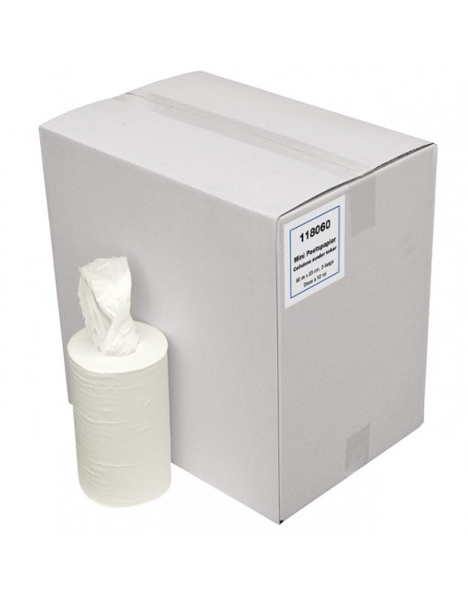 * Mini rol 2-laags cellulose papier, cordless. * De Mini rollen zijn van goede kwaliteit, hierdoor geschikt voor diverse toepassingen. * Extra hoog grams gewicht. * Hoog absorptievermogen en absorptiesnelheid. * Zeer zacht en pluisarm. * Geperforeerd per 38cm. * 2-laags embossed papier. * Rollengte 80m. * Rolbreedte 20cm. * Roldiameter 12,5cm. * Pak van 12 rollen.
