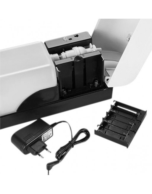 * RVS zuil met dispenser. * Met een "no touch" sensor. * Bij te vullen met o.a. desinfectie vloeistof 1386620 of 1387497 (500ml). * Met adapter voor de "no touch" sensor. * Hij werkt ook op 6AA baterijen, deze zijn echter niet meegeleverd. * Spray in 3 standen in te stellen. * Met extra zware voet van Ø32cm. * Hoogte 136cm. * Breedte 17,5cm. * Reservoir 1200ml wat goed is voor gem. 3000 spray momenten. * Er zit een klein lekbakje onder. * Wordt geleverd zonder vloeistof. * Uiterlijk van de ''voet'' kan afwijken.