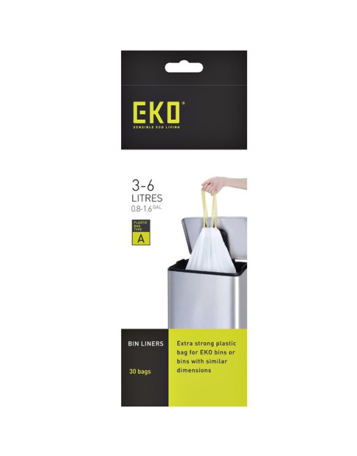 * De EKO Afvalzak type A 3-6 liter is een extra sterke, perfect passende afvalzakken voor afvalbakken of prullenbakken met vergelijkbare afmetingen. * Voorzien van handige trekband voor het makkelijk sluiten en dragen van de vuilniszak. * Afmetingen 35x40cm. * Rol à 30 stuks.