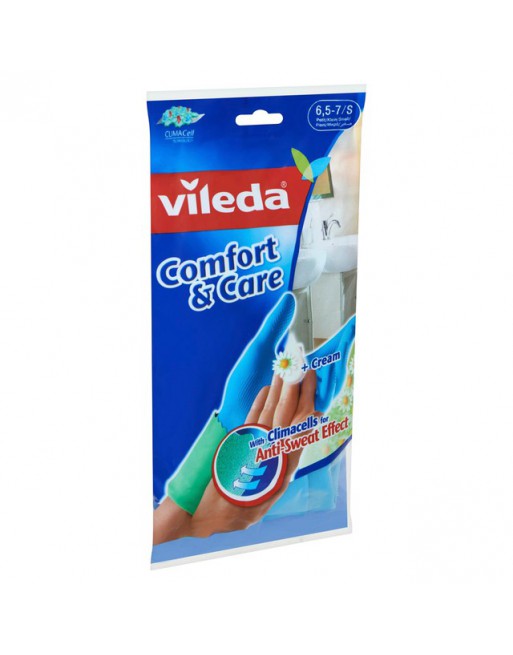 * Met de innovatieve Vileda Comfort en Care handschoenen voor de gevoelige huid kunt u uw dagelijkse schoonmaak veilig, snel en comfortabel uitvoeren. * Deze handige en herbruikbare latex handschoenen zijn perfect voor taken zoals de vaat of schoonmaak. * De absorberende binnenvoering voorkomt zweethanden. * Ze beschermen bovendien uw huid bij gebruik van reinigingsmiddelen.
