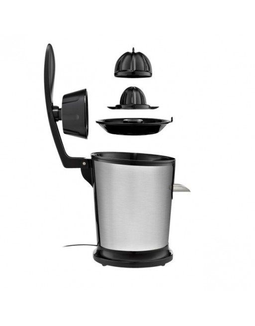 * Elektrische citruspers met een stijlvol design en roestvrijstalen behuizing en pulpfilter. * Twee perskegels die linksom draaien en geschikt zijn voor alle soorten citrusfruit. * Dankzij de druppelstop kies je zelf voor directe sapuitloop of het opsparen van het sap in het reservoir. * Eenvoudig schoon te maken omdat je de losse onderdelen in de vaatwasser kunt reinigen. * Dankzij de unieke pershendel heb je veel minder kracht nodig om sinaasappels, citroenen en limoen uit te persen. * Wat vind je in de doos: Citruspers, twee perskegels en een handleiding.