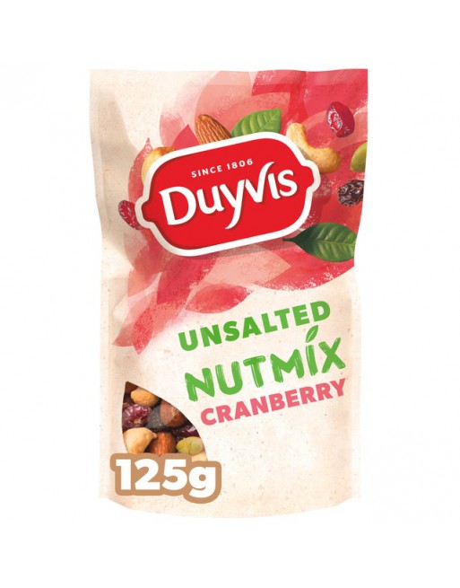 * Duyvis Unsalted Nutmix Cranberry is een heerlijke notenmix met cranberries, amandelen, rozijnen, cashewnoten en pompoenzaadjes. * Geschikt voor ieder moment van de dag. * Dit product is heerlijk als tussendoortje, voor- of na het sporten maar kan ook heel goed door je ontbijt. * Een zak bevat 125 gram.