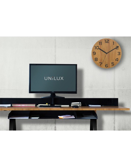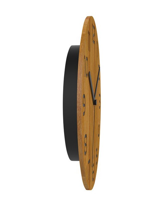* Neo retro design. * Deze klok is trendy en modern dankzij de bamboe wijzerplaat. * Eco product: het gebruik van bamboe en recyclebaar hoogwaardig staal draagt zo bij aan het behoud van natuurlijke hulpbronnen en het verminderen van de milieu-impact. * Ergonomie: dankzij het geluidsloze systeem maakt de secondewijzer geen geluid en zorgt voor een betere concentratie. * Precisie: Quartz uurwerk van hoge kwaliteit, slechts 1 seconde afwijking in 6 jaar. * Leesbaarheid: een diameter van 30cm voor een maximale leesbaarheid tot 35m dankzij de afmeting van de grote zwarte cijfers. * Aanvullende producten: de wandklok PALMA BAMBOO past perfect bij de BAYA BAMBOO bureaulamp, BALY BAMBOO vloerlamp en de BORA BAMBOO staande kapstok. * Van gecertificeerd Bamboe. * Snelle wandmontage met 1 ophangoog. * Inclusief 1 AA 1,5v batterij. * Diameter: 30 cm. * Dikte: 3,5 cm. * Gewicht: 0,56 kg. * 2 jaar garantie. * Materiaal: Bamboe wijzerplaat.