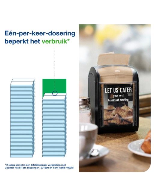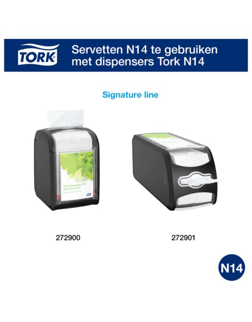 * Tork Xpressnap Fit Servetten N14 "Signature Line", naturel. *Met de Xpressnap Fit heeft Tork een bijzonder efficiënt servettenconcept ontwikkeld. Hiermee kunnen quickservice-restaurants slimmer en hygiënischer werken. * Deze papieren servetten worden gebruikt om de Tabletop- en Counterdispensers van de Tork Xpressnap Fit-"Signature Line" te vullen. * Gemaakt van bleekmiddelvrij, FSC-gecertificeerd en 100% gerecycled materiaal, om een belangrijke bijdrage te leveren aan betere duurzaamheid. *De gevouwen papierservetten worden één-per-keer en volledig uitgevouwen uitgegeven uit de dispenser. * Het systeem vermindert ongebruikte, weggegooide servetten met meer dan 50%*/**. * Daarnaast is de individuele uitgave van servetten bijzonder hygiënisch. * Slimmer gebruik van krappe ruimte, de compacte verpakking vermindert de benodigde voorraadruimte voor servetten met tot wel 35%**. * Taken zoals het navullen van de dispenser worden efficiënter dankzij de vulindicator. * Ook tijdens piekmomenten zijn servetten altijd binnen handbereik – om een constant hoog serviceniveau te waarborgen. * Tussen vulmomenten kunt u tot 90%* meer gasten bedienen. * Dit ontlast het personeel, dat zich daardoor kan concentreren op de hoofdzaken – service, eten en gasten. * Bij de Xpressnap Fit gaat efficiëntie nooit ten koste van de servicekwaliteit – integendeel. * Dit slimme, efficiënte concept garandeert dat uw gasten tevreden zijn – of het nu gaat om een restaurant, een café, een foodtruck of een snackbar. *Levering omvat: 6 x 6 bundels x 120 servetten, geschikt voor de N14-dispensersystemen. * Ongevouwen L 213mm x B165 mm – 2-laags, naturel.