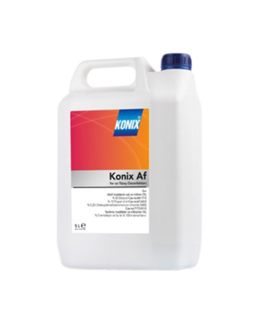* Konix AF 5000ML Floor and Surface Cleaning Spray. *De Konix AF producten zijn onverdunt te gebruiken op alle alcoholbestendige oppervlakten. * Ze hebben een effectieve werking en zijn snel drogend. * Ze bevatten ca. 50% Ethyl Alcohol en 10% Propan-2-ol.voor een gevoelige huid. * Waterloos gebruik op alcoholbasis. * Spray van een afstand (ca.30 cm) zodat alle oppervlakten bedekt zijn. * Na aanbrengen even laten inwerken voor optimaal effect. * Met schone en droge doek nabehandelen. * CTGB goedgekeurd. * Veiligheidsinformatie: bij huidcontact spoelen met overvloedig water. * Bij contact met de ogen voorzichtig afspoelen met water gedurende een aantal minuten. * Contactlenzen verwijderen en indien mogelijk blijven spoelen. * Indien nodig een arts raadplegen. * Na inslikken: bij onwel voelen een antigifcentrum of arts raadplegen. * Bij ernstige of aanhoudende stoornissen: frisse lucht, rust en arts waarschuwen. *Dit product is enkel voor beroeps en bedrijfsmatig gebruik.