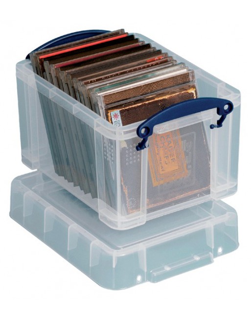 * Really Useful opbergboxen zijn stapelbaar met of zonder deksel. * Ze zijn zo sterk dat het het gewicht van één persoon houdt. * Elk product is bestendig tegen temperaturen van -15°C tot +80°C. * Minimale zijkant aanpassingen om opbergruimte te maximaliseren, dit zorgt tevens ook dat de inhoud minder kan bewegen tijdens transport. * Volledig platte en versterkte bodem. * Het sluitmechanisme houdt de doos en het deksel tezamen. * De doorzichtige doos heeft het voordeel dat u steeds de inhoud ziet. * De verschillende afmetingen zijn onderling opstapelbaar. * Goed voor 18cd's of 10 dvd's. 1 stuk