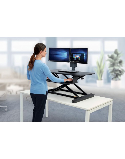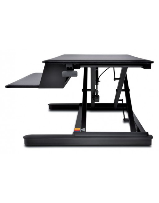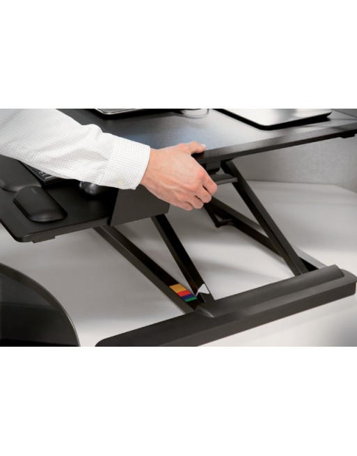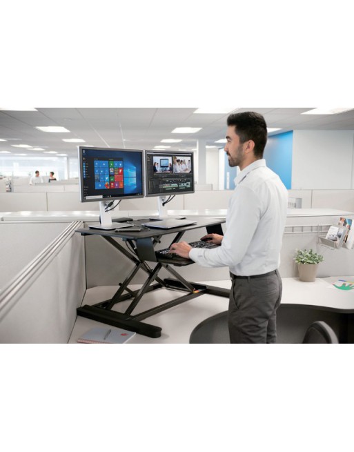 * Het SmartFit-zit-stabureau biedt een efficiënte en veilige manier om uw bureau te veranderen in een gezond werkstation voor zitten en staan door middel van een eenvoudig bureau-op-bureau-design en beschikt over gepatenteerde Kensington-technologie om een juiste pasvorm te garanderen. * Het Kensington SmartFit™-zit-stabureau biedt optimale productiviteit en ergonomische ondersteuning dankzij zijn kracht en stabiliteit op elke hoogte en de pneumatische lift waarmee u uw werkplek moeiteloos kunt verhogen en verlagen in een ruimtebesparende oplossing. * Volledig gemonteerd geleverd. * Professionele structuur met twee niveaus biedt een bureaubladoppervlak van 90cm breed met voldoende ruimte voor twee monitoren, documenten en andere bureaubladaccessoires. * Pneumatische lift met systeem voor spanningsaanpassing stelt u in staat eenvoudig de liftspanning af te stellen op basis van het gewicht van het werkstation voor een vloeiende en moeiteloze aanpassing tussen de zit- en stastand. * In hoogte verstelbaar over 58cm maakt het ook geschikt voor lange mensen dankzij het stevige en stabiele werkstation, zelfs op maximale hoogte. * Gewichtscapaciteit van 15,9kg ondersteunt maximaal 13,6kg op het hoofdplateau en maximaal 2,3kg op het plateau voor een toetsenbord en muis.