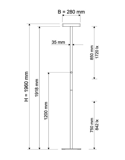 * Traploos instelbare dimmer afhankelijk van de activiteit en individuele behoefte. * Lichtverdeling naar boven ca. 50% en naar beneden ca. 50%. * Op 2 manieren te gebruiken: direct licht op de werkplek en indirect licht als ruimte-verlichting. * De uitgesneden voetplaat kan om een tafelpoot heen worden geplaatst. * 4000Kelvin, neutraal warm-wit licht. * De lamp bevat geïntegreerde led-lampen die niet kunnen worden vervangen. * De leds hebben een levensduur van 30.000uur. * Energie-efficiëntie klasse "A+". * Laag energieverbruik van ca. 80Watt. * 1800lux lichtsterkte bij 85cm afstand naar boven, 1160lux bij 110cm. * Lichtstroom 7100lumen. * Stevige aluminium zuil van 3,5x5,5cm. * Hoogte ca. 196cm. * Gesloten lampenkap van 28x61cm. * Schakelaar op de zuil, hoogte ca. 120cm. * Stevige massieve stalen voet van 30x45cm.
