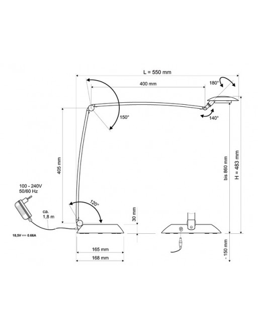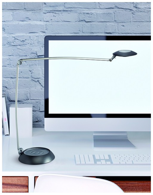 * Dimbare bureaulamp met een overtuigende prijs-/kwaliteitsverhouding. * Bijzonder designelement wordt gevormd door de licht gewolven armen. * Stabiele fijngevormde arm van geanodiseerd aluminium. * Dimmer via touchpad met 7 standen aan lampenvoet. * 12 hoog rendement LED's, 4100Kelvin, neutraal wit licht. * De armatuur bevat ingebouwde LED's die niet vervangen kunnen worden. * Levensduur van de LED's ca. 20.000uur. * Energieklasse A. * Laag energieverbruik ca. 8Watt. * Lichtsterkte van 2080Lux op 35cm afstand. * Lichtstroom 440lumen. * Armlengte boven 40cm en beneden 40,5cm. * Hoogte in normale werkpositie 46cm. * De kap 12,7x11cm is 180° draaibar und 140° neigbaar. * De stabiele verzwaarde voet Ø21x16,5cm, is voorzien van een werkblad beschermende onderlaag.