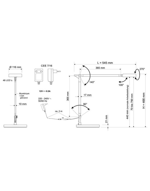 * Designlicht van uitstekende kwaliteit met dubbele arm. * Flexibel, kleurtemperatuur traploos en verlichtingssterkte in 4 niveaus instelbaar, afhankelijk van het tijdstip en de staat. * Modern design, duidelijke lijnen, minder elegantie. * Armen in geborsteld en geanodiseerd aluminium. * Handig, bediening via het aanraakpaneel op de armatuurkop. * Met 48 LED's 24 warm wit (3000 Kelvin) en 24 daglicht wit (6500 Kelvin). * Armatuur bevat ingebouwde LED-lampen die niet kunnen worden vervangen. * Levensduur van de LED's 20.000uur. * Energie-efficiëntieklasse "A". * Extreem laag energieverbruik met ca. 6Watt. * 1400lux Verlichtingssterkte op 35cm afstand. * Lichtstroom 300lumen. * Dubbel gelede arm draaibaar en kantelbaar. * Armlengte onder en boven elke 36,5cm. * Hoogte in normale werkpositie 44cm. * Armatuurkop Ø11,6cm, draaibaar en kantelbaar, kunststof met aluminium inzetstuk. * Stabiele basis Ø20,5cm, met verzwaringsinzetstuk en desk-vriendelijke.ondertapijt.