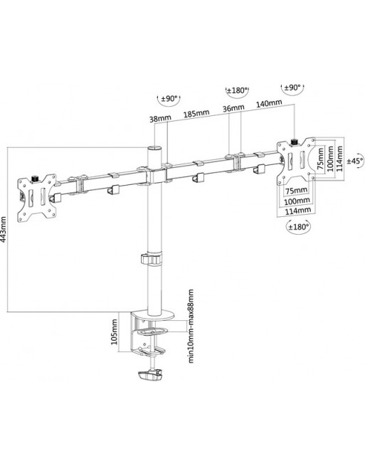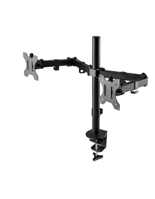 * Met deze monitorarm bevestigt u twee flatscreens aan het bureau via een bureauklem of bladdoorvoer. * Door gebruik te maken van een monitorarm profiteert u optimaal van de mogelijkheden van uw monitor. * De monitorarm is eenvoudig in hoogte en diepte te verstellen. * Tevens kunt u het scherm kantelen, zwenken en roteren. * Hierdoor creëert u de ideale ergonomische werkhouding. * Dit verkleint de kans op nek- en rugklachten. * Kabels zijn netjes weg te werken aan de onderzijde van de horizontale arm. * De arm heeft 3 draaipunten en is geschikt voor 2 schermen t/m 32". * Het draagvermogen van de arm is 8 kg per scherm. * Dit product is geschikt voor schermen met een VESA gatenpatroon van 75x75 mm of 100x100 mm.