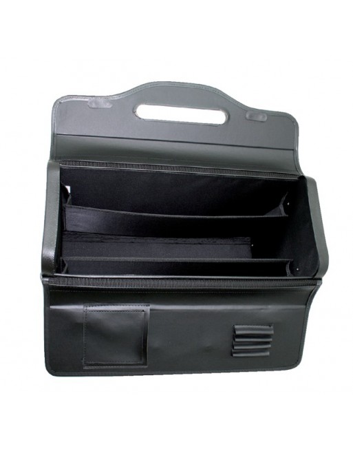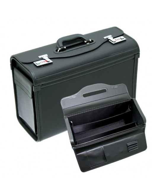 * Pilotenkoffer Rondo is vervaardigd uit lederlook materiaal. * Het interieur is verdeeld 2 compartimenten, een grote en een kleine documentenhouder. * Door de grote binnenmaten kunnen A4 mappen staand opgeborgen worden. * Op de binnenzijde van de bovenklep 2 balpenhouders en een insteekvak voor visitekaartjes. * De koffer is afsluitbaar middels twee zilverkleurige 3-cijferige sloten. * Buitenmaten: ± 45,5 (b) x 33,5 (h) x 19,5 (d) cm. * Binnenmaten: ± 40 (b) x 32 (h) x 18,5 (d) cm. * Kleur zwart. 1 stuk