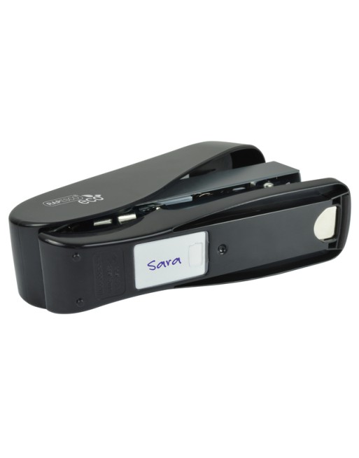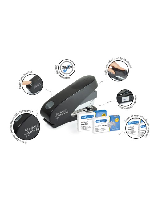 * Bereik meer met minder moeite dankzij de nieuwe Rapesco Luna: een stevige nietmachine voor halve stroken. * Dit model is gemaakt van gerecycled kunststof (bovenkap handvat en onderkap) met geïntegreerde Germ-Savvy® die levenslange antibacteriële bescherming biedt, waardoor de groei van bacteriën permanent wordt geremd en dit product zeer geschikt is voor gedeeld gebruik. * Deze krachtige nietmachine is voorzien van een handig voorlaadsysteem, waardoor snel en gemakkelijk kan worden bijgeladen, en is uitgerust met een veiligheidsremsysteem voor een gecontroleerde uitwerping van het magazijn. * Met een nietcapaciteit tot 50 vel (80 g/m²) maakt de ECO Luna Less Effort gemakkelijk werk van zowel kleine als grote ladingen, en het duurzame en ergonomische ontwerp zorgt voor een soepele nietervaring met 50% minder inspanning. * Geleverd met 1000 stuks 24/8 mm nietjes en 1000 stuks 24/6 mm, voor een snelle en gemakkelijke start. Voor optimale prestaties gebruikt u 26/6 of 24/6 mm voor het nieten van maximaal 25 vel en 26/8 of 24/8 mm voor het nieten van maximaal 50 vel. * Ondersteund door onze 25 jaar garantie.
