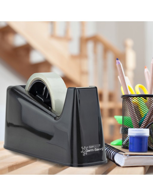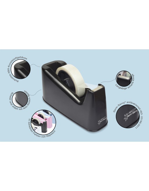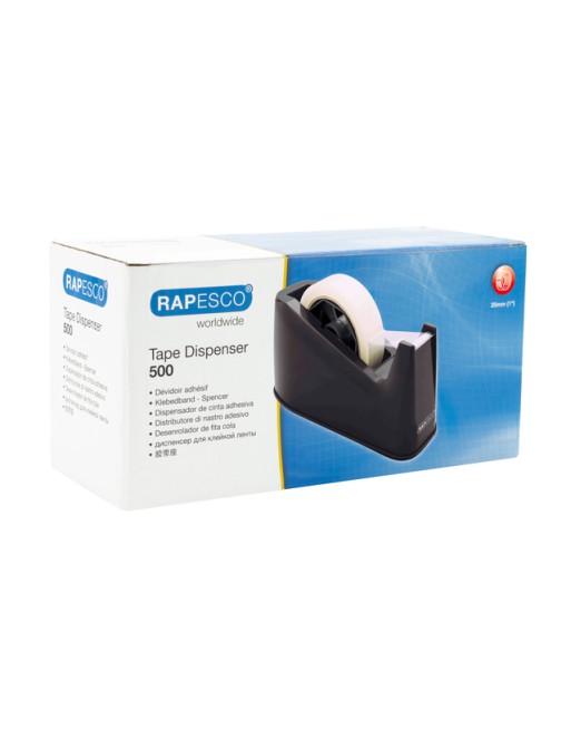 * De 500 Tape Dispenser van Rapesco is ontworpen voor dagelijks en zwaar verpakkingswerk. * Met een zware antislipvoet voor extra stabiliteit en een gemakkelijk te gebruiken scherp mes, bevat dit product tevens Germ-Savvy® antibacteriële bescherming, waardoor het ideaal is voor gezamenlijk gebruik op kantoor, op school of thuis. * Het is compatibel met standaard 25 mm brede bandrollen van 33 m en 66 m, en wordt geleverd in een mooie zwarte kleur die op elk bureau past. * Ondersteund door onze garantie van 3 jaar.