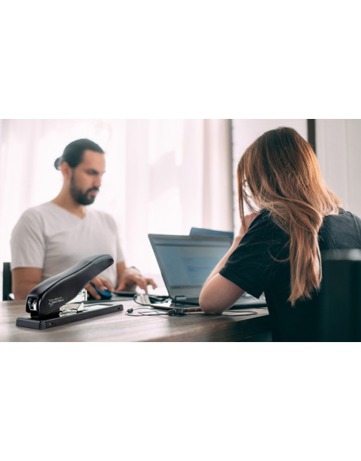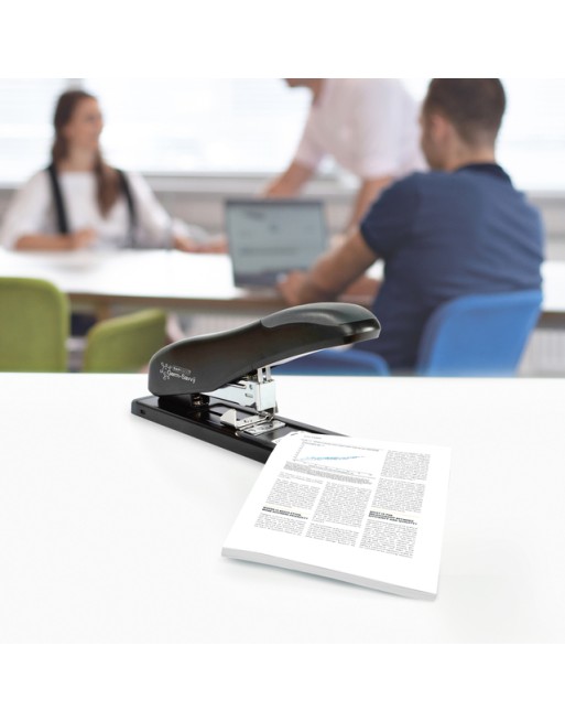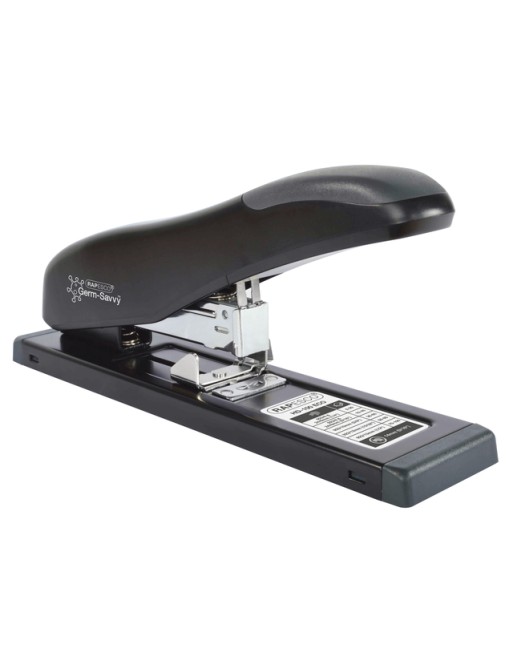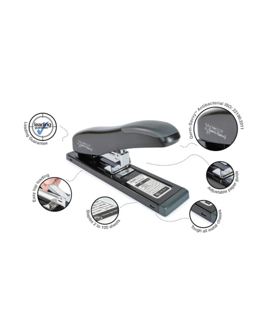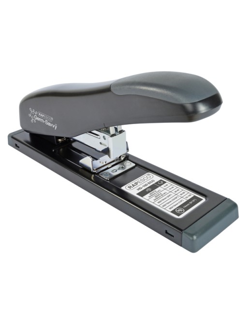 * Deze heavy duty nietmachine voor 100 vel, gemaakt van een hoog gehalte gerecycled plastic, maakt moeiteloos werk van veeleisende nietklussen. * Deze handige, bovenlader nietmachine is voorzien van Germ-Savvy® antibacteriële bescherming en heeft een capaciteit van maximaal 100 vel (80 g/m²). * Daarnaast heeft de machine een uniek papiergeleidings-/vergrendelingssysteem en een zacht aanvoelende rubberen handgreep voor comfort. * Germ-Savvy® biedt permanente, levenslange bescherming die de groei van bacteriën tegengaat, waardoor dit product zeer geschikt is voor gemeenschappelijk gebruik in kantoren en scholen. * De ECO HD-100 is geschikt voor Rapesco 923/6-13 mm nietjes en 24/8 mm en 24/6 mm Extra Strong nietjes - * Ondersteund door onze 25 jaar garantie.