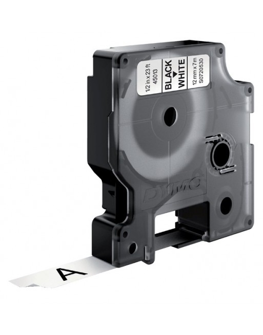 * De standaard Dymo D1 tapes zijn geschikt voor gebruik op gladde en vlakke ondergrond. * Indien u de tapes op een gebogen oppervlak wilt gebruiken, zoals stroomkabels, dan moet u de Dymo D1 flexibele nylon tape gebruiken. * Voor ruwe oppervlakken is de Dymo D1 permanent polyester tapehet meest geschikt. * De standaard D1 tape is geschikt voor vrijwel alle Dymo LabelManagers en Dymo LabelPoint tape printers. * D1 tapes zijn niet geschikt voor tape printers van andere merken en ook niet geschikt voor LetraTagen en Rhinoprinters. * Met een 12mm brede tape kunt u zeer duidelijke belettering aanbrengen. * De 12mm tape is de meest gebruikte tape en daarmee geschikt voor alle normale beletteringstaken. * Hou rekening met de marges die langs de randen van de tape nodig zijn voor de printer, de tekstgrootte zal maximaal 9mm zijn. * De bandlengte is 7m. * De kleur van de tape is wit de opdruk zwart.