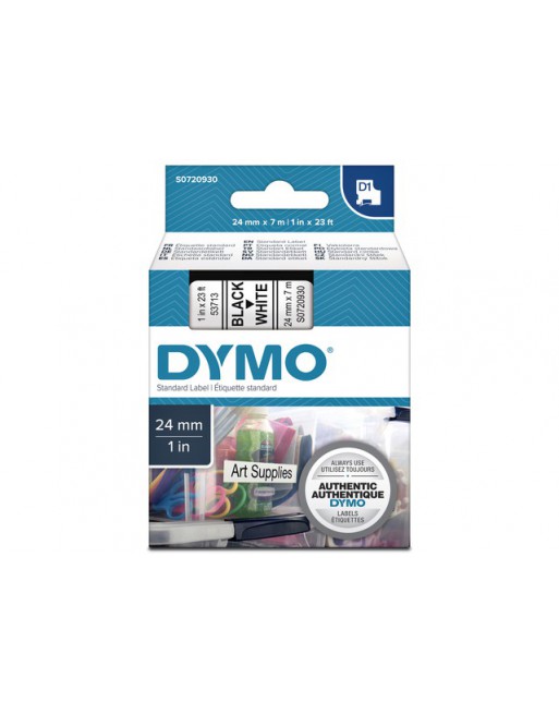 * De standaard Dymo D1 tapes zijn geschikt voor gebruik op gladde en vlakke ondergrond. * Indien u de tapes op een gebogen oppervlak wilt gebruiken, zoals stroomkabels, dan moet u de D1 flexibele nylon tape gebruiken. * Voor ruwe oppervlakken is de D1 permanent polyester tape het meest geschikt. * De standaard D1 tape is geschikt voor vrijwel alle Dymo LabelManagers en Dymo LabelPoint tape printers. * Dymo D1 tapes zijn niet geschikt voor tape printers van andere merken en ook niet geschikt voor LetraTag en Rhinoprinters. * Met een 24mm brede tape kunt u hele grote labels maken en labels met meerdere regels tekst die toch nog goed leesbaar zijn. * Hou rekening met de marges die langs de randen van de tape nodig zijn voor de printer, de tekstgrootte zal maximaal 21mm zijn. * De bandlengte is 7m. * De kleur van de tape is wit, de opdruk zwart. 1 stuk