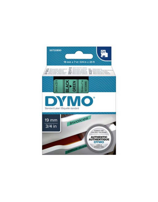 * De standaard Dymo D1 tapes zijn geschikt voor gebruik op gladde en vlakke ondergrond. * Indien u de tapes op een gebogen oppervlak wilt gebruiken, zoals stroomkabels, dan moet u de D1 flexibele nylon tape gebruiken. * Voor ruwe oppervlakken is de D1 permanent polyester tape het meest geschikt. * Deze standaard Dymo D1 tape is geschikt voor vrijwel alle Dymo LabelManagers en Dymo LabelPoint tape printers. * Dymo D1 tapes zijn niet geschikt voor tape printers van andere merken en ook niet geschikt voor LetraTag en Rhinoprinters. * Met een 19mm brede tape kunt u duidelijke belettering aanbrengen. * Hou rekening met de marges die langs de randen van de tape nodig zijn voor de printer, de tekstgrootte zal maximaal 16mm zijn. * Ook wordt deze tape veel gebruikt voor het printen van barcodes en productlabels voor winkelschappen. * De bandlengte is 7m. * De kleur van de tape is groen, de opdruk is zwart. 1 stuk
