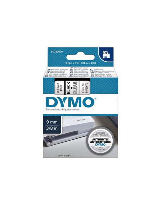 * Deze standaard Dymo D1 tapes zijn geschikt voor gebruik op gladde en vlakke ondergrond. * Indien u de tapes op een gebogen oppervlak wilt gebruiken, zoals stroomkabels, dan moet u de D1 flexibele nylon tape gebruiken. * Voor ruwe oppervlakken is de D1 permanent polyesther tape het meest geschikt. * De standaard Dymo D1 tape is geschikt voor vrijwel alle Dymo LabelManagers en Dymo LabelPoint tape printers. * Dymo D1 tapes zijn niet geschikt voor tape printers van andere merken en ook niet geschikt voor LetraTagen en Rhinoprinters. * Met een 9mm brede tape kunt u hele fijne belettering aanbrengen. * Hou rekening met de marges die langs de randen van de tape nodig zijn voor de printer, de tekstgrootte zal maximaal 6mm zijn. * De bandlengte 7m. * Deze tape is transparant met een zwarte opdruk. 1 stuk