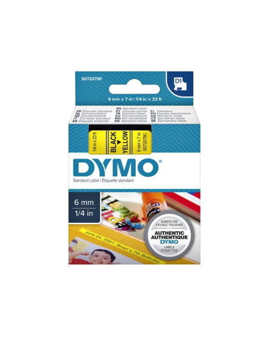 * Deze standaard Dymo D1 tapes zijn geschikt voor gebruik op gladde en vlakke ondergrond. * Indien u de tapes op een gebogen oppervlak wilt gebruiken, zoals stroomkabels, dan moet u de D1 flexibele nylon tape gebruiken. * Voor ruwe oppervlakken is de D1 permanent polyesther tape het meest geschikt. * De standaard Dymo D1 tape is geschikt voor vrijwel alle Dymo LabelManagers en Dymo LabelPoint tape printers. * Dymo D1 tapes zijn niet geschikt voor tape printers van andere merken en ook niet geschikt voor LetraTag en Rhinoprinters. * Met een 6mm brede tape kunt u hele fijne belettering aanbrengen. * Hou rekening met de marges die langs de randen van de tape nodig zijn voor de printer, de tekstgrootte zal maximaal 4mm zijn. * De bandlengte 7m. * Deze tape is geel met een zwarte opdruk. 1 stuk