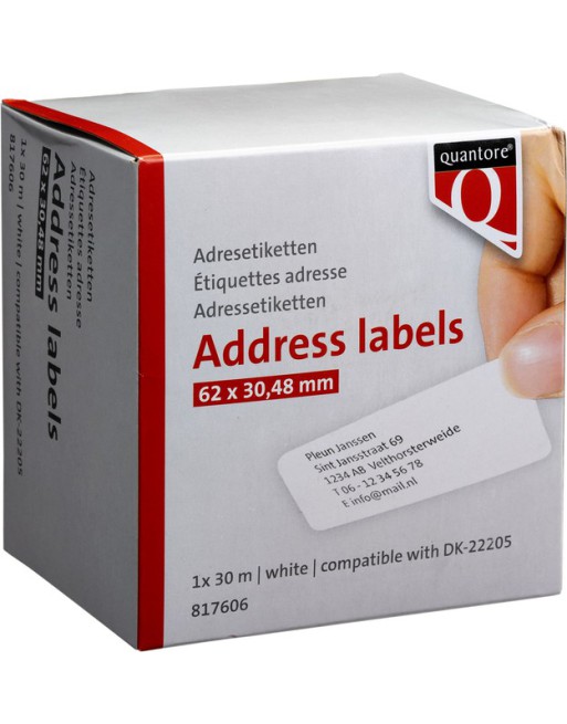 * Witte papieren labels. * Of u nu labels maakt voor enveloppen, mappen of voor op schappen, u kunt altijd rekenen op maximale flexibiliteit om op maat labels te creëren. * De DK-22205 doorlopende labelrol heeft een sterke hechtlaag die zorgt voor permanente kleefkracht, waardoor deze erg handig is zowel bij u thuis als op kantoor. * Breedte 62mm en lengte 30,48meter. 1 rol x 30.48 meter
