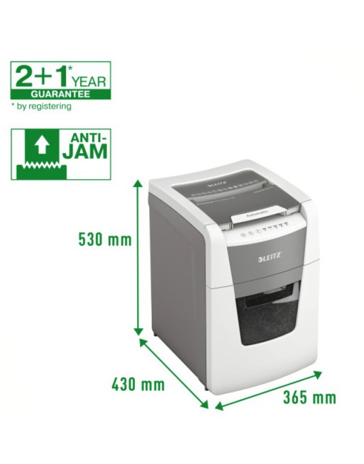* Volautomatische papiervernietiger met automatische invoerfunctie voor maximaal 100 A4-vellen. * Versnippert tot 8 vellen (80gr) tegelijkertijd bij handmatige invoer. * Unieke ”Clean emptying” functie (mesjes keren na gebruik terug) voorkomt dat papiersnippers achterin de bak vallen als je hem eruit haalt, zodat je de bak altijd kunt legen zonder rommel. * ”Bak vol” infraroodsensor en 80%-vol-melding waarschuwen de gebruiker dat de bak geleegd moet worden om rommel te voorkomen. * Stillere werking voor een rustige werkomgeving (bij regelmatig gebruik van Leitz olievellen). * Anti-vastlooptechnologie voor ononderbroken papiervernietiging. * Stopt automatisch en duwt het papier naar buiten als er te veel papier wordt ingevoerd. * Continue werkduur van 20 minuten. * Ideaal om grote hoeveelheden in één keer te vernietigen. * Eco-sluimerstand na 3 minuten inactiviteit. * Veiligheidsniveau DIN P4. * Cross cut snippers (4x28mm). * Royale uittrekbare bak van 34L zodat alle invoer in één keer kan worden vernietigd. * Touch paneel - simpel en intuïtief voor eenvoudig gebruik. * Vernietigt creditcards, nietjes en paperclips. * 365 (b) x 530 (h) x 430 (d). * 2 + 1 jaar garantie (ook op de messen) - registreer de machine om het extra garantiejaar te claimen.