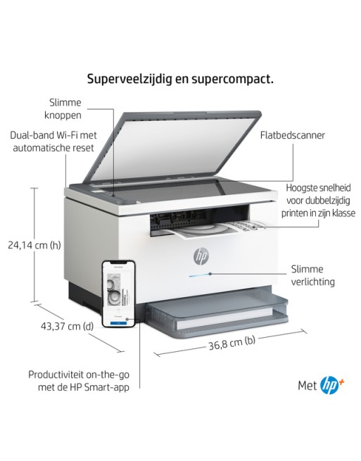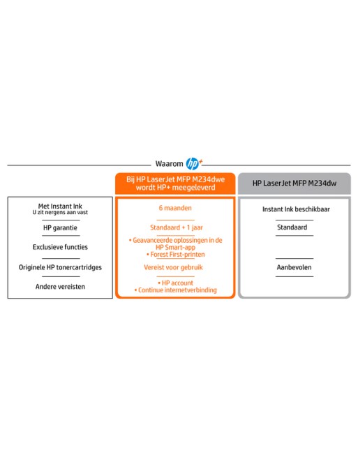 * Een zeer productieve MFP die sneller dubbelzijdig print dan elk ander apparaat in zijn klasse, met automatische documentinvoer en de tijdbesparende HP Smart-app. * Profiteer van de betrouwbare verbindingen en de vereenvoudigde setup. * Printtechnologie: Laser, Zwart-wit. * Apple AirPrint™; HP Smart-app; Mopria™-gecertificeerd. * Printen met Wi-Fi® Direct, Hi-Speed USB 2.0; Fast Ethernet; Dual-band (2,4/5,0GHz). * Invoerlade 150 vel, uitvoerlade 100 vel. * Automatisch dubbelzijdig printen, standaard 1 papierlade, A4 formaat. * Afmeting: 242 x 368 x 299 mm, gewicht 7,6 kg. * Inhoud van de doos: HP LaserJet MFP M234dw printer, HP zwarte LaserJet tonercartridge (700 pagina's), Stofklep, Naslaggids, Installatieposter, Garantiegids en flyer in sommige landen, Netsnoer. * Niet inbegrepen: USB-kabel moet apart worden aangeschaft. * Dit is een HP+ printer. * Hiervoor is een HP account, verbinding met het internet en exclusief gebruik van originele HP tonercartridges tijdens de gehele levensduur van de printer vereist. * Disclaimer: Bepaalde HP-printers zijn bestemd om alleen te werken met cartridges die nieuwe of hergebruikte HP-chips of elektronische HP-circuits hebben. Door periodieke firmware-updates wordt de effectiviteit van de dynamische beveiligingsmaatregelen behouden en blokkeren cartridges die eerder wel werkten en dus geen nieuwe of hergebruikte HP chips, of originele elektronische HP-circuits hebben. Cartridges die gebruik maken van hergebruikte HP-chips en elektronische HP-circuits blijven dus mogelijk om te gebruiken.
