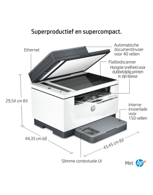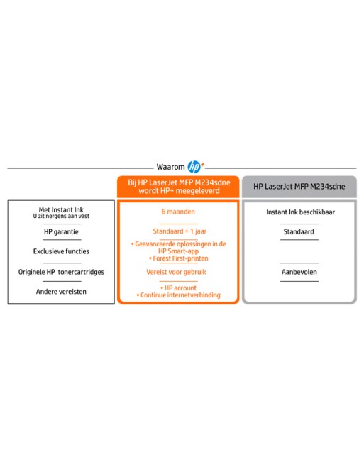 * Een zeer productieve MFP die sneller dubbelzijdig print dan elk ander apparaat in zijn klasse, met automatische documentinvoer en de tijdbesparende HP Smart-app. * Profiteer van een zorgeloze ervaring met vereenvoudigde setup. * Laserprinter, zwart- wit. Printen, kopieren en scannen. * Invoercapaciteit tot 150 vel, uitvoercapaciteit tot 100 vel. * Automatisch dubbelzijdig printen, 1 papierlade, A4 formaat. * Afmetingen: 295 x 418 x 308mm, gewicht 9,5 kg. * Inhoud van de doos: HP LaserJet MFP M234sdn printer, HP zwarte LaserJet tonercartridge (700 pagina's), Naslaggids, Installatieposter, Garantiegids en flyer in sommige landen, Netsnoer. * Niet inbegrepen: USB-kabel moet apart worden aangeschaft. * Dit is een HP+ printer. * Hiervoor is een HP account, verbinding met het internet en exclusief gebruik van originele HP tonercartridges tijdens de gehele levensduur van de printer vereist. * Disclaimer: Bepaalde HP-printers zijn bestemd om alleen te werken met cartridges die nieuwe of hergebruikte HP-chips of elektronische HP-circuits hebben. Door periodieke firmware-updates wordt de effectiviteit van de dynamische beveiligingsmaatregelen behouden en blokkeren cartridges die eerder wel werkten en dus geen nieuwe of hergebruikte HP chips, of originele elektronische HP-circuits hebben. Cartridges die gebruik maken van hergebruikte HP-chips en elektronische HP-circuits blijven dus mogelijk om te gebruiken.