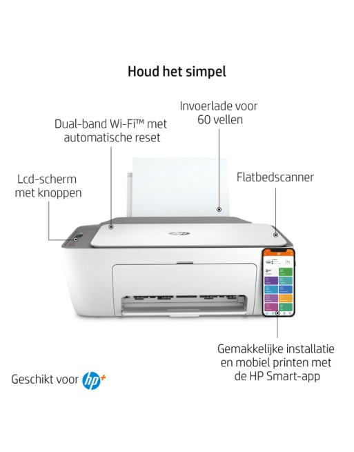 * Alle handige basisfuncties. * Printen, scannen en kopiëren, eenvoudige installatie met de HP Smart-appen het gemak van draadloos. * Printtechnologie: Thermische inkjet, Printen: Afdrukken in kleur, Maximale resolutie: 4800 x 1200 DPI, Printsnelheid (kleur, standaard, A4/US Letter): 5,5 ppm. * Kopiëren: Kopiëren in kleur, Maximale kopieerresolutie: 300 x 300 DPI. * Scannen: Scannen in kleur, Optische scanresolutie: 1200 x 1200 DPI. * Maximale ISO A-series papierformaat: A4. Wifi. * Kleur van het product: Wit. * Disclaimer: Bepaalde HP-printers zijn bestemd om alleen te werken met cartridges die nieuwe of hergebruikte HP-chips of elektronische HP-circuits hebben. Door periodieke firmware-updates wordt de effectiviteit van de dynamische beveiligingsmaatregelen behouden en blokkeren cartridges die eerder wel werkten en dus geen nieuwe of hergebruikte HP chips, of originele elektronische HP-circuits hebben. Cartridges die gebruik maken van hergebruikte HP-chips en elektronische HP-circuits blijven dus mogelijk om te gebruiken.