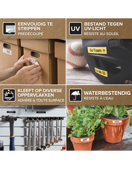 * Een DYMO-klassieker, Lettertang Reliëf tapes zorgen voor een mooi en aantrekkelijk driedimensionaal effect. * Ze vervagen niet na verloop van tijd, en bij het verwijderen laten ze geen lijmresten achter en scheuren niet. * Het maakt niet uit waar u de plastic lettertanglabels van DYMO® gebruikt; ze gaan zowel binnen als buiten lang mee. * Ze blijven goed kleven op elk glad, schoon oppervlak en zijn verkrijgbaar in verschillende kleuren voor een extra visuele impact en gemakkelijke communicatie. * De verpakking met Plastic lettertang Reliëf tapes bestaat uit een combinatie van 65% gerecycleerde en FSC-gecertificeerde materialen. * Bestand tegen temperaturen van: - 20 °C tot 60 °C . * UV- en waterbestendige labels.