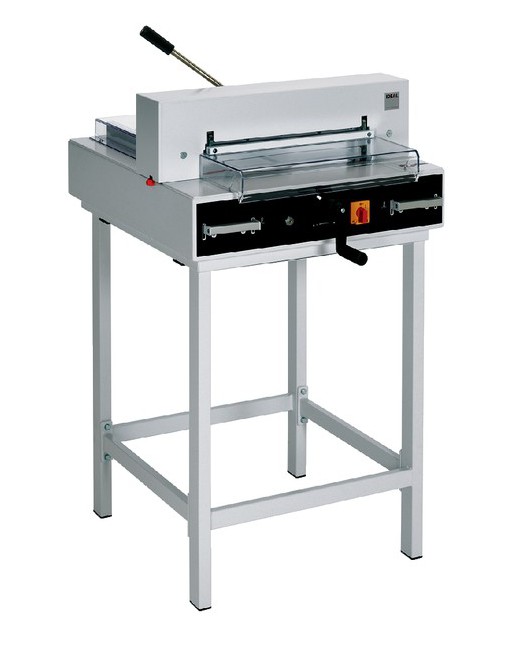 * Elektrische stapelsnijmachine met papieraandruk d.m.v. een hefboom. * Snijlengte 430mm. * Inlegdiepte 435mm (voor Din A3). * Precies positioneren achteraanleg. * Digitale maataanduiding. * Goed leesbaar en middels druktoets om te stellen van cm naar inch aanduiding. * Gepatenteerde papieraandruk d.m.v. hefboom. * Snijhoogte 40mm. * Minimaal te snijden 35mm. * Tafeldiepte 435mm. * Netaansluiting 230Volt/50 Hz/1. * Motorprestatie (Nen) 0,45KW. * Afmetingen H360xB640xD880mm. * Hoogte incl. onderstel 1055mm. * Hoogte incl. onderkast 1080mm. * Gewicht 81kg, incl. onderstel 91kg, incl. onderkast 113kg. 1 stuk