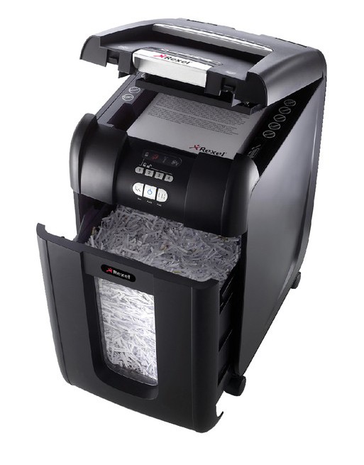 * De Rexel Auto+ 300 is een papiervernietiger met een extreem hoog veiligheidsniveau (DIN P5). * Vernietigt in snippers van 2x15mm. * Automatisch invoer voor maximaal 300vellen 80gr, aparte opening voor maximaal 8 vellen. * Invoermond voor vernietigen van creditcards. * Uitneembare opvangbak van 40 liter, met kijkvenster. * Led indicatorlampjes voor 'deur open', 'opvangbak vol', 'terugloop', 'afkoelen', 'overbelast/blokkering'. * Automatische terugloopfunctie. * Zelfreinigende snijkop. * Geluidsniveau kleiner dan 60dBA. * Vernietigt ook nietjes, paperclips en creditcards. * Aparte handmatige papierinvoer voor 8vel. 1 stuk