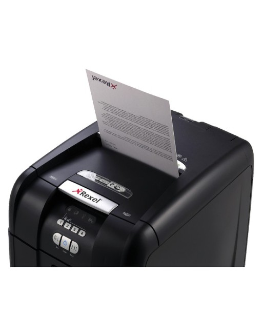 * De Rexel Auto+ 300 is een papiervernietiger met een hoog veiligheidsniveau (DIN P4). * Vernietigt in snippers van 4x40mm. * Automatisch invoer voor maximaal 300vellen 80gr, aparte opening voor maximaal 8 vellen. * Invoermond voor vernietigen van creditcards. * Uitneembare opvangbak van 40 liter, met kijkvenster. * Led indicatorlampjes voor 'deur open', 'opvangbak vol', 'terugloop', 'afkoelen', 'overbelast/blokkering'. * Automatische terugloopfunctie. * Zelfreinigende snijkop. * Geluidsniveau kleiner dan 60dBA. * Vernietigt ook nietjes, paperclips en creditcards. * Aparte handmatige papierinvoer voor 8vel. 1 stuk